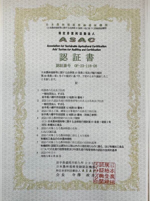 現在 法人で製造・販売している黒にんにくについて有機JAS加工認証を受けました。 原材料はすばるファームで育てたオーガニックにんにくを使い、熟成工程でも食品添加物を一切使わず作りました。 すばるのWebショップで販売しておりますので、ご興味があれば是非お試し下さい。